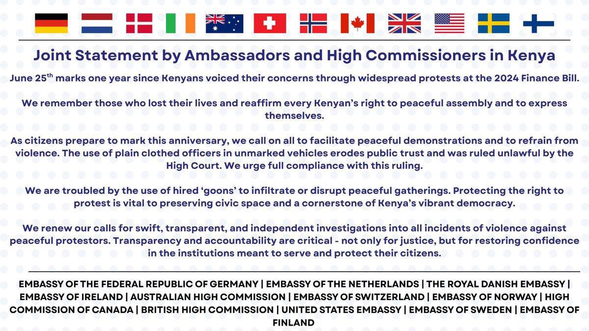 Embassies from the U.S., U.K., and Canada urged restraint and condemned the use of plain-clothed officers. Kenya’s Ministry of Foreign Affairs countered that diplomatic partnerships require mutual respect.